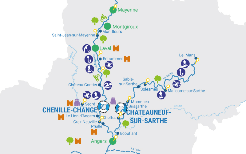 Situé entre Laval et Angers, en Pays de Loire, Chenillé-Changé est le point de départ d’une croisière sur l’une des plus méconnues mais pourtant des plus belles rivières de France : la Mayenne. Ponctuée d’écluses fleuries et longée par une voie verte sur plus de 80 km, cette rivière offre à la fois toute l’intimité d’une navigation au cœur de la nature et la richesse d’un patrimoine culturel très varié : abbaye du Port Salut, vieille ville de Laval, Château du Plessis – Mace, le haras du Lion d’Angers, la Petite Couère… Au Sud-ouest de Chenillé-Changé, un détour sur l’Oudon, petite rivière pleine de charme, s’impose. Au Sud-est, près d’Angers, la Mayenne rejoint la Sarthe qui chemine à travers des paysages pittoresques jusqu’à la ville du Mans.